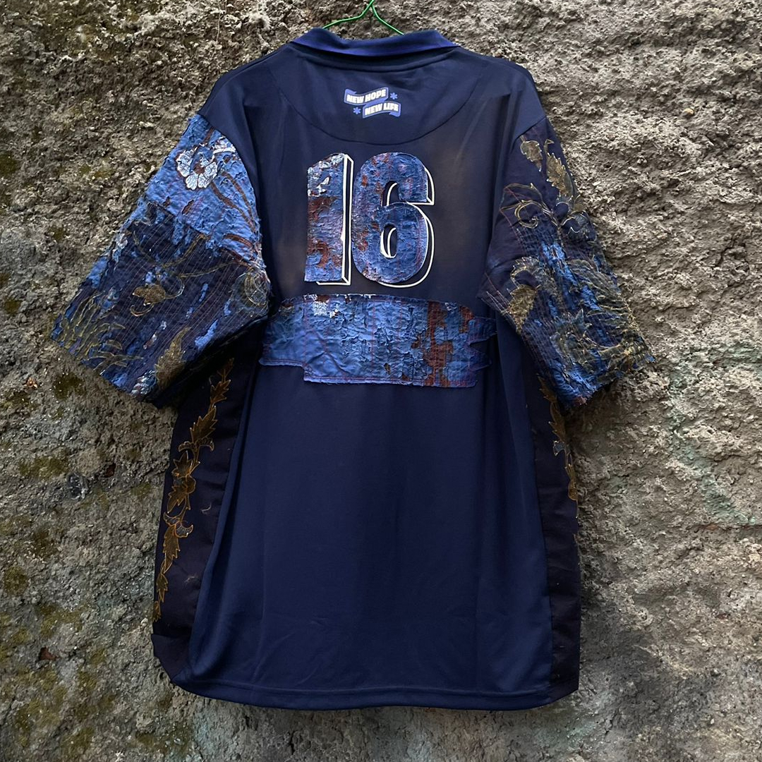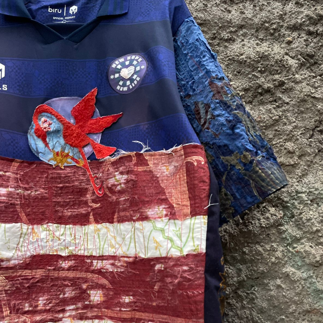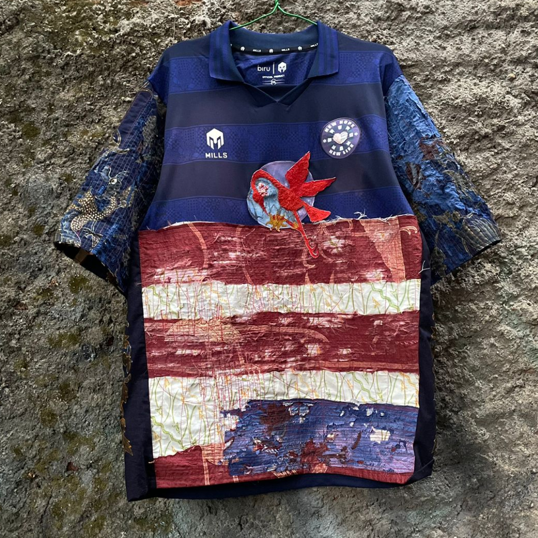 Aligning with Senjawa’s first article titled “Holopis Kuntul Baris,” which metaphorically suggests the image of herons flying in a straight line, symbolizing people working together harmoniously towards a common goal, we have partnered with Biru Berbagi to take this concept further. We created upcycled jerseys from Biru Berbagi, stitched together with our waste of fine batik tulis, as fine batik tulis has high margin errors, by the hands of a young artist from Bandung, Labib Santika (FeelFlow). By stitching our values together, we’re hoping to give new hope and new life to the community and the heritage.